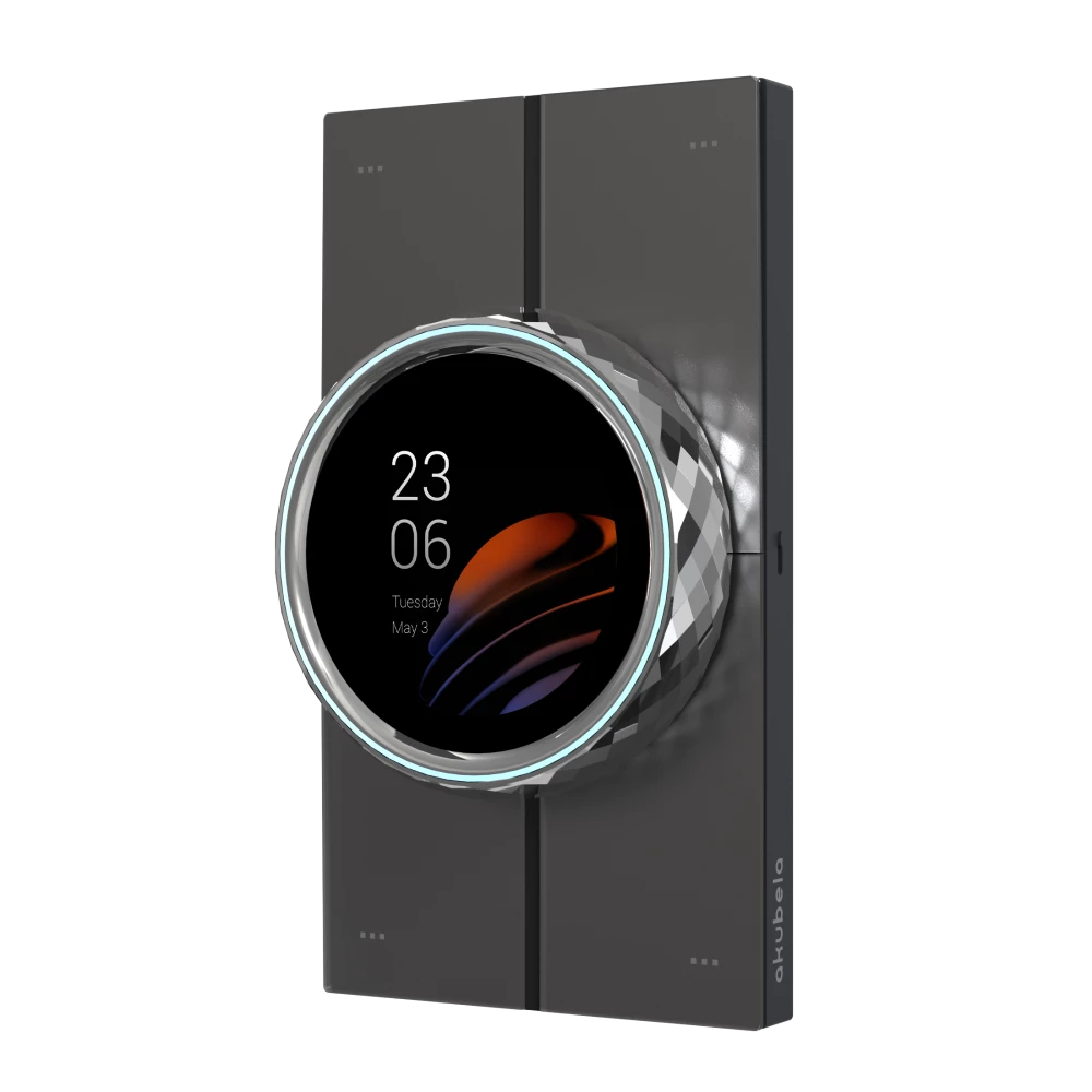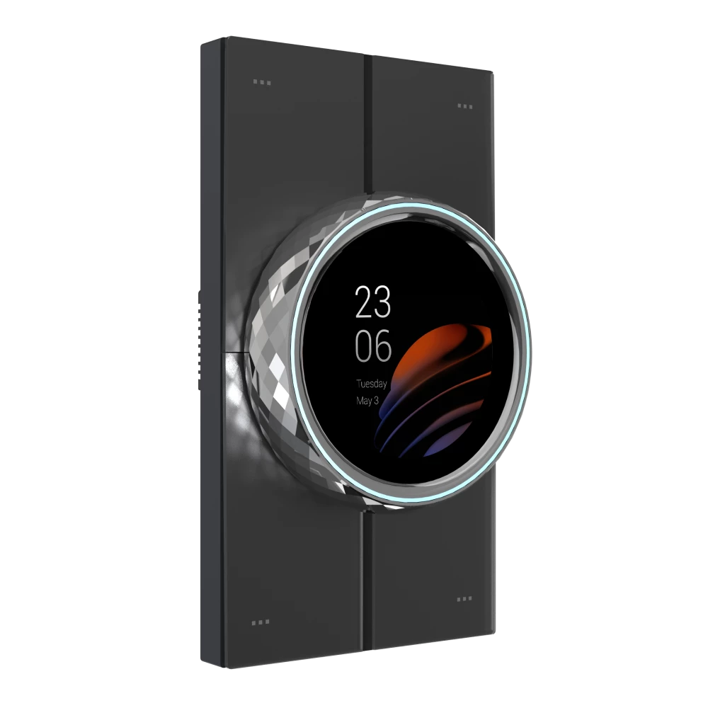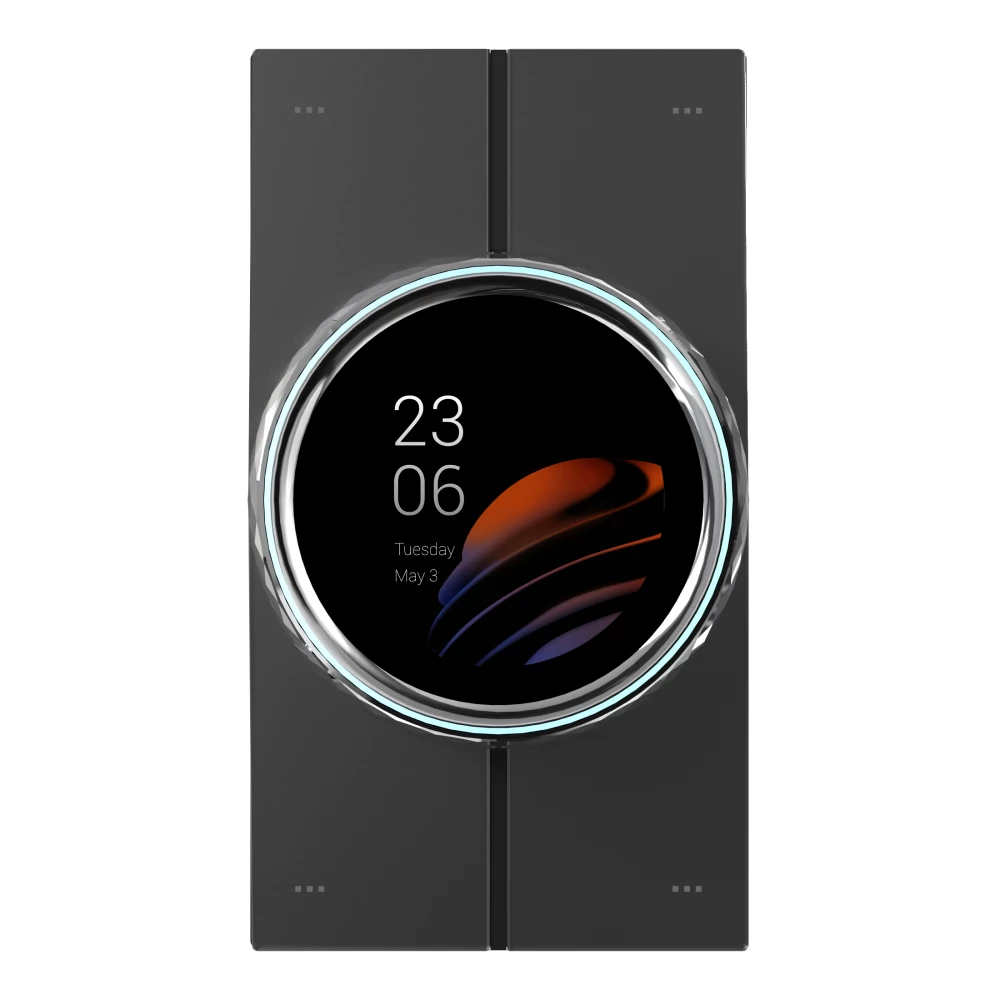 это сенсорная панель управления с поддержкой KNX, объединяющая в себе функции визуализации, контроля и управления умным домом. Устройство работает под управлением Android 10, поддерживает связь по Ethernet и беспроводным интерфейсам, а также подключение к KNX-шине. Вращающееся кольцо с переключаемыми режимами и подсветкой, сенсорный экран и стеклянные кнопки обеспечивают гибкое и комфортное взаимодействие. Панель может отображать данные KNX-устройств и служить шлюзом для ZigBee-устройств.
