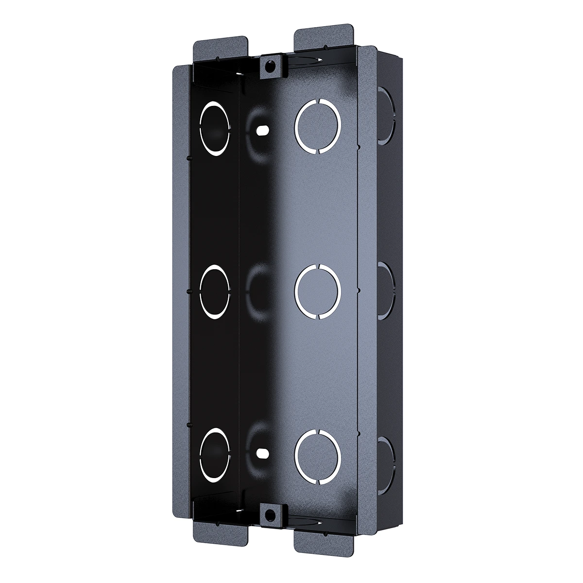 Металлический монтажный короб предназначен для врезного монтажа вызывных панелей Akuvox R20K и Akuvox R20B в твёрдые основания, такие как кирпич, бетон или монолит. Он обеспечивает надёжную фиксацию и точную посадку устройства при установке в фасады зданий, въездные стойки или внешние стены.